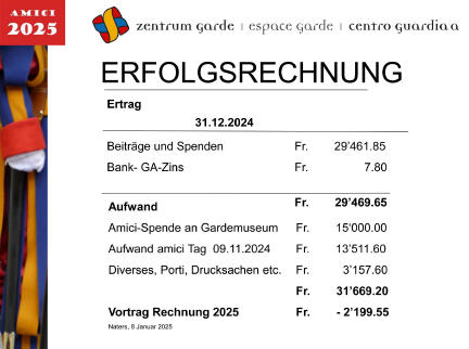 Die Mitgliederzahl unseres Vereins ist damit auf über 1000 Stifter und Amici angewachsen. Wir sind ein wenig stolz. Als verlängerter Arm des Stiftungsrats ist unser Amici-Club für die Geldbeschaffung und die Organisation des Amicifestes zuständig. Wir tun dies mit Freude, weil Ihr uns nach Kräften unterstützt, sei es mit Fr. 50.- Jahresbeitrag pro Person oder mit einmaligen CHF 1000.– oder mehr. (Steuerlich absetzbar!). Die Stifter (CHF 1000.– und mehr) werden zudem für alle Zeiten in der Ehrengalerie der Garde erdbebensicher verewigt und wunderschön hell beleuchtet. Seid bitte spendabel, denn das letzte Hemd hat keine Taschen und wir haben noch viele Super-Ideen in der Pipeline! Wie es sich gehört, werden wir als Team vor Euch kurz Rechenschaft ablegen.